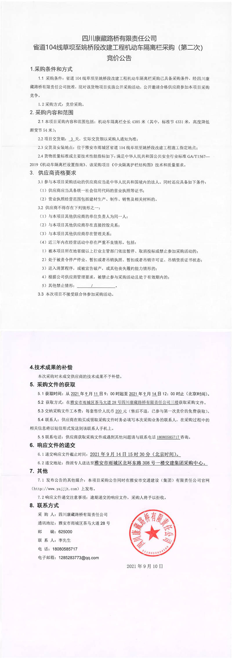 四川康藏路橋有限責(zé)任公司省道104線(xiàn)草壩至姚橋段改建工程機(jī)動(dòng)車(chē)隔離欄采購(gòu)(第二次)競(jìng)價(jià)公告