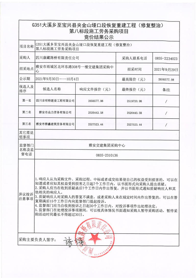 四川康藏路橋有限責(zé)任公司G351大溪鄉(xiāng)至寶興縣夾金山埡口段恢復(fù)重建工程(修復(fù)整治)第八標(biāo)段施工勞務(wù)采購(gòu)項(xiàng)目競(jìng)價(jià)結(jié)果公示