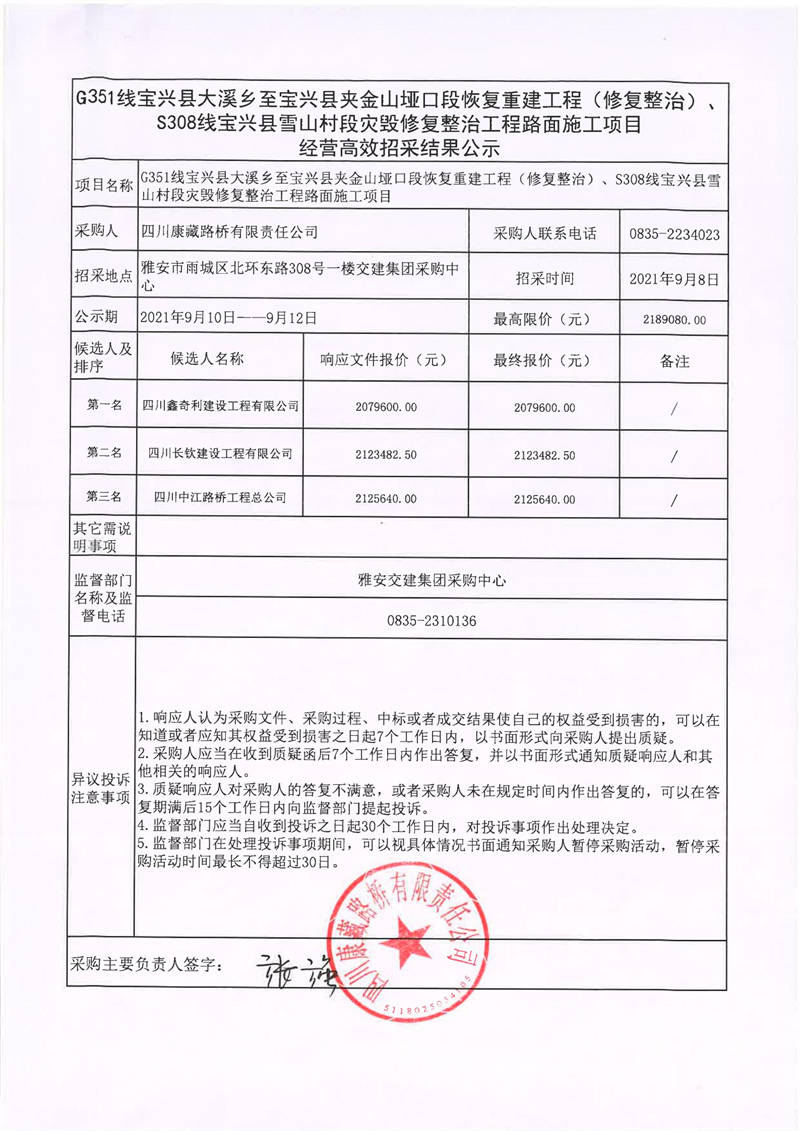 四川康藏路橋有限責(zé)任公司G351線寶興縣大溪鄉(xiāng)至寶興縣夾金山啞口段恢復(fù)重建工程(修復(fù)整治)、S308線寶興縣雪山村段災(zāi)毀修復(fù)整治工程路面施工項目經(jīng)營高效招采結(jié)果公示