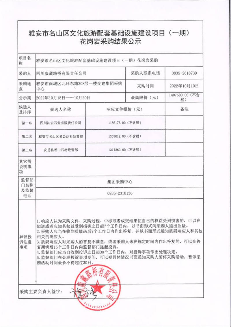 四川康藏路橋有限責(zé)任公司雅安市名山區(qū)文化旅游配套基礎(chǔ)設(shè)施建設(shè)項(xiàng)目(一期)花崗巖采購(gòu)結(jié)果公示