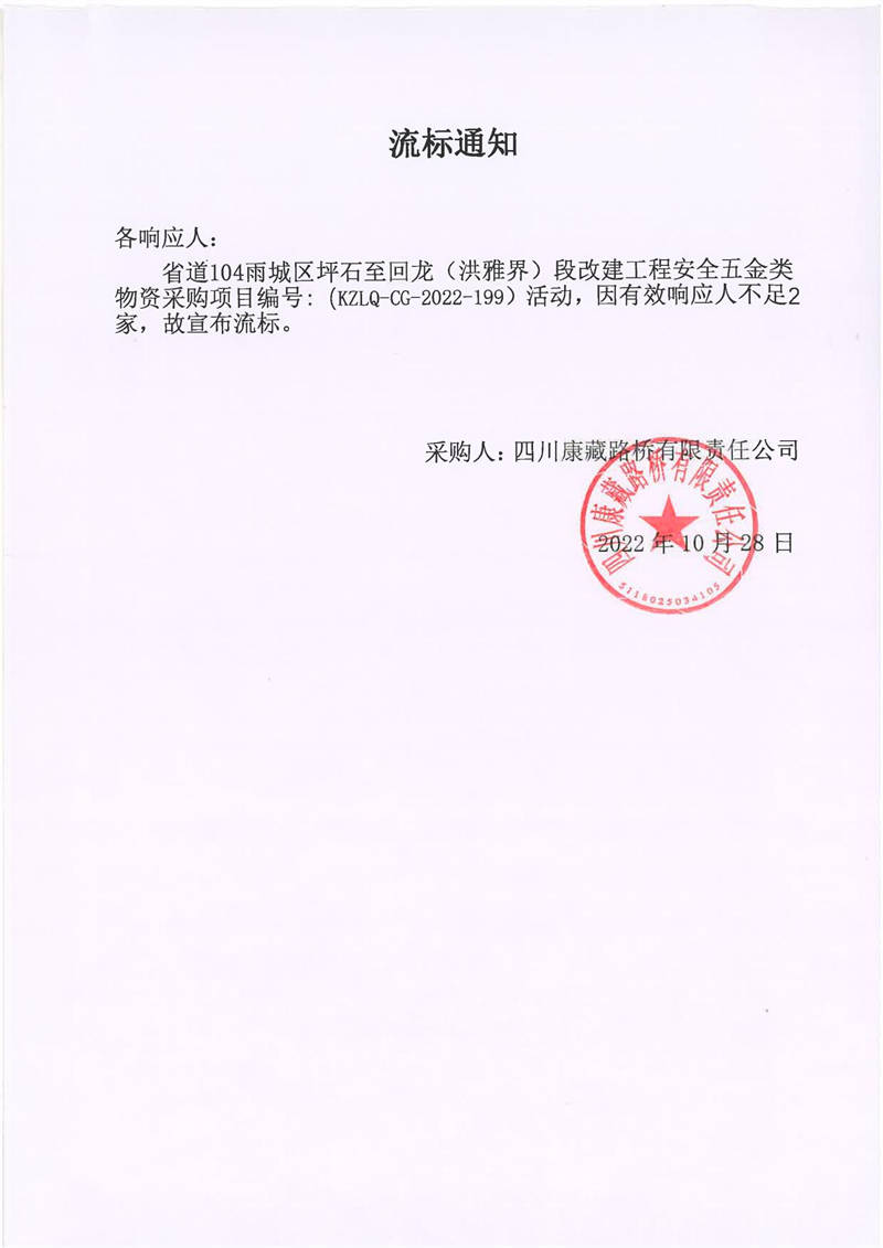 四川康藏路橋有限責(zé)任公司省道104雨城區(qū)坪石至回龍(洪雅界)段改建工程安全五金類物資采購項(xiàng)目流標(biāo)通知