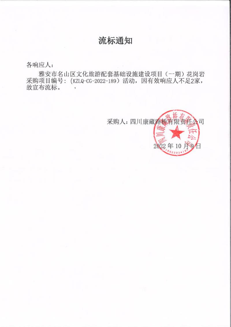 四川康藏路橋有限責任公司雅安市名山區(qū)文化旅游配套基礎設施建設項目(一期)花崗巖采購項目流標通知