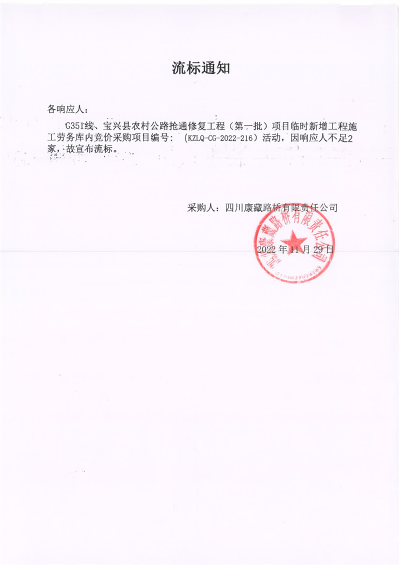 四川康藏路橋有限責(zé)任公司G351線(xiàn)、寶興縣農(nóng)村公路搶通修復(fù)工程(第一批)項(xiàng)目臨時(shí)新增工程施工勞務(wù)庫(kù)內(nèi)競(jìng)價(jià)采購(gòu)流標(biāo)通知