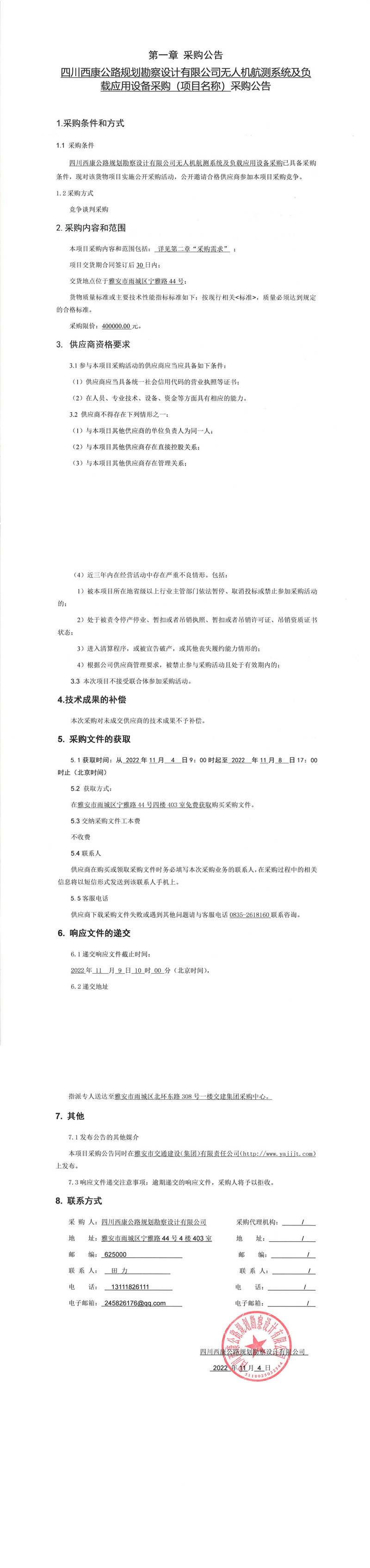 四川西康公路規(guī)劃勘察設(shè)計有限公司無人機(jī)航測系統(tǒng)及負(fù)載應(yīng)用設(shè)備采購(項目名稱)采購公告
