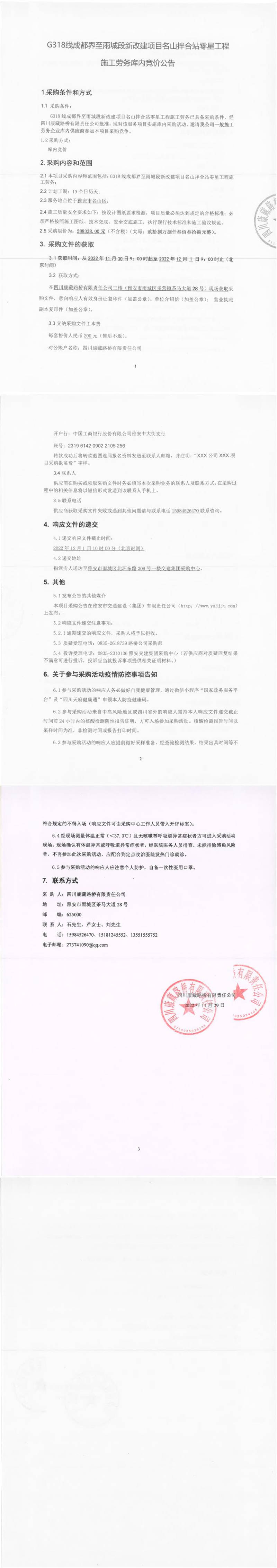 四川康藏路橋有限責(zé)任公司G318線成都界至雨城段新改建項(xiàng)目名山拌合站零星工程施工勞務(wù)庫內(nèi)競價(jià)公告