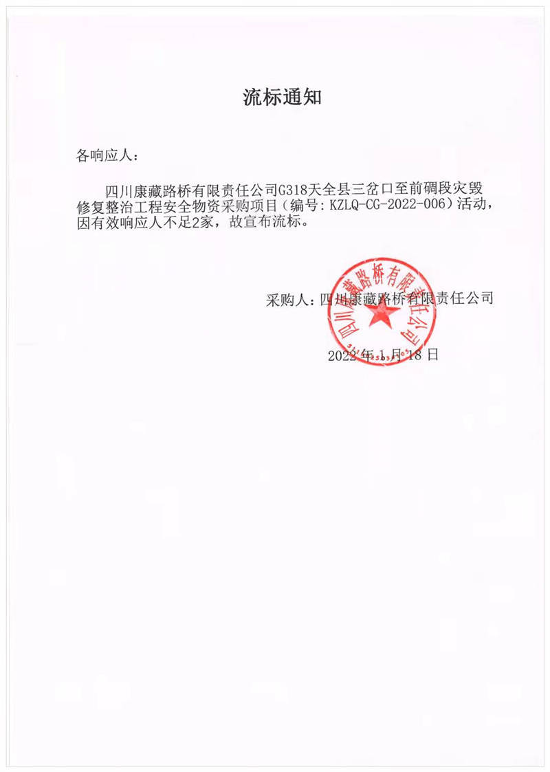 四川康藏路橋有限責(zé)任公司G318天全縣三岔口至前碉段災(zāi)毀修復(fù)整治工程安全物資采購(gòu)項(xiàng)目流標(biāo)通知
