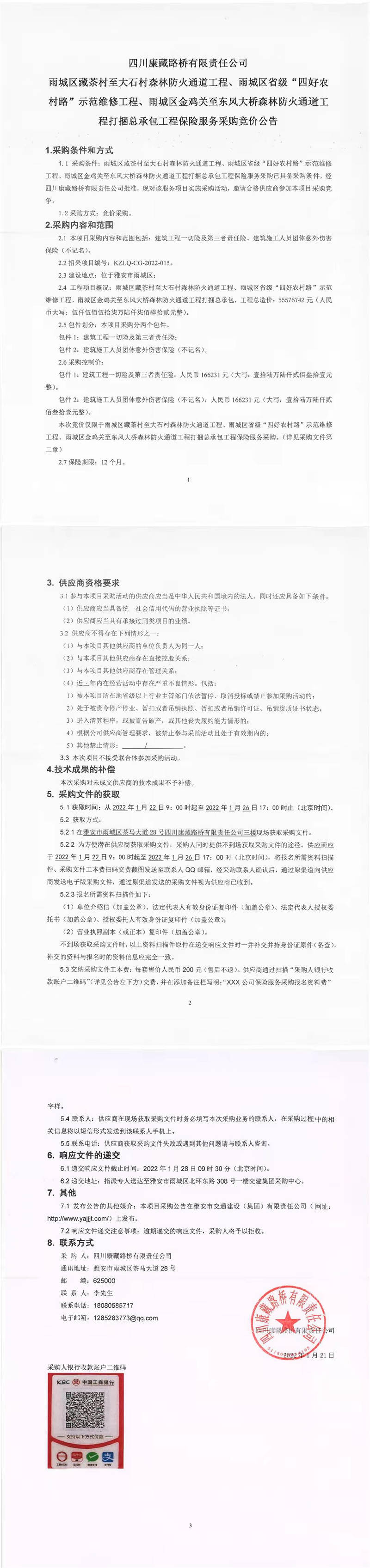 四川康藏路橋有限責任公司雨城區(qū)藏茶村至大石村森林防火通道工程、雨城區(qū)省級“四好農(nóng)村路”示范維修工程、雨城區(qū)金雞關(guān)至東風大橋森林防火通道工程打捆總承包工程保險服務采購競價公告