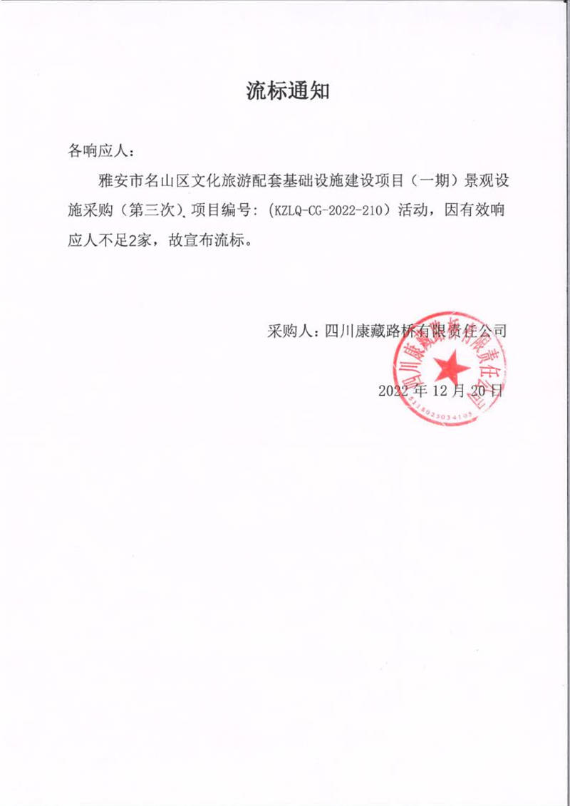 四川康藏路橋有限責(zé)任公司雅安市名山區(qū)文化旅游配套基礎(chǔ)設(shè)施建設(shè)項(xiàng)目(一期)景觀(guān)設(shè)施采購(gòu)(第三次)流標(biāo)通知