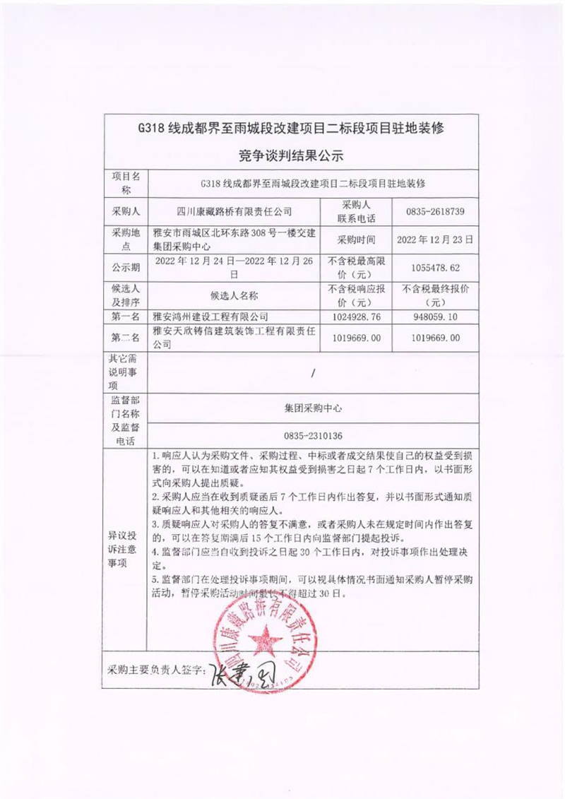 四川康藏路橋有限責任公司G318線成都界至雨城段改建項目二標段項目駐地裝修競爭談判結果公示