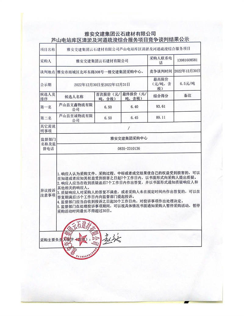 雅安交建集團(tuán)云石建材有限公司蘆山電站庫區(qū)清淤及河道疏浚綜合服務(wù)項(xiàng)目競(jìng)爭(zhēng)談判結(jié)果公示