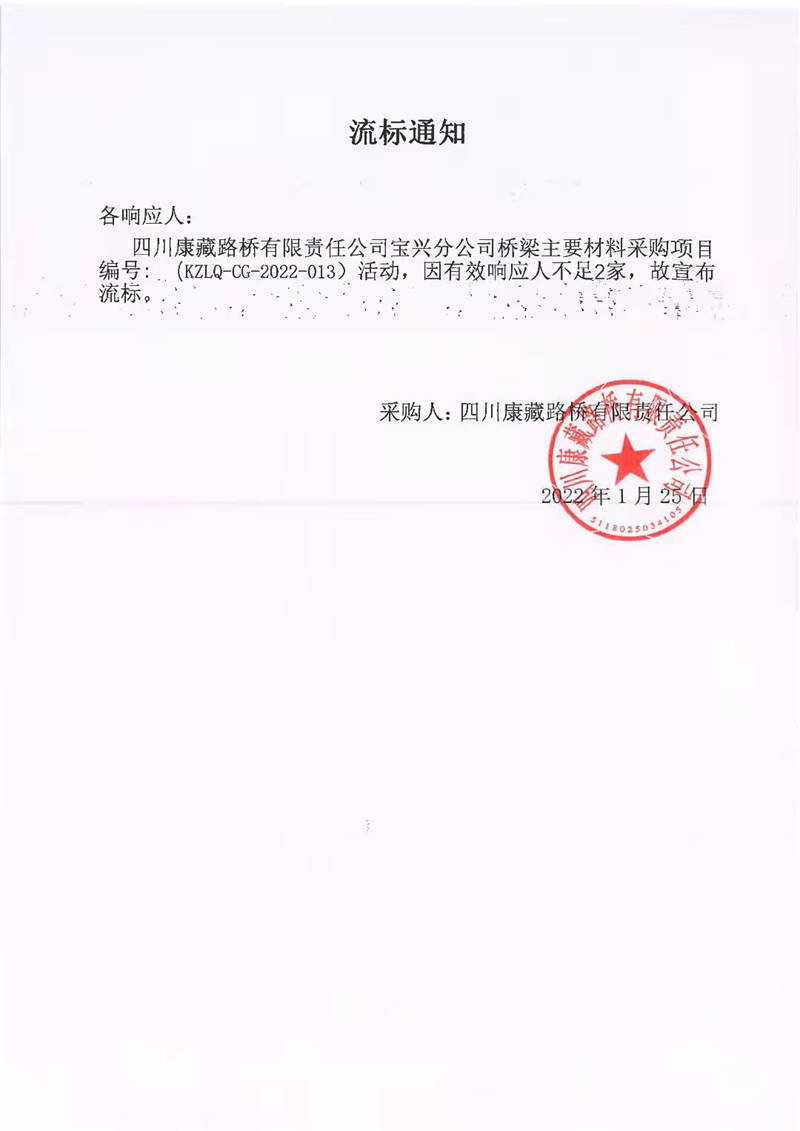 四川康藏路橋有限責(zé)任公司寶興分公司橋梁主要材料采購項目流標通知