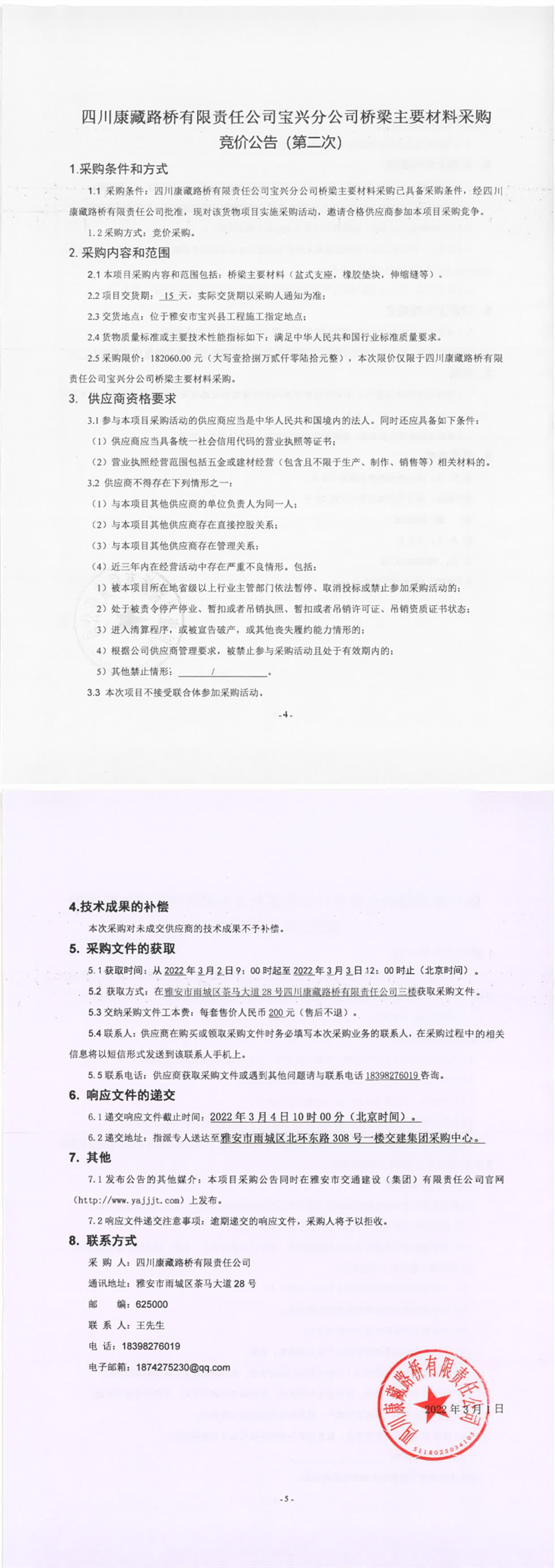 四川康藏路橋有限責(zé)任公司寶興分公司橋梁主要材料采購競價公告(第二次)