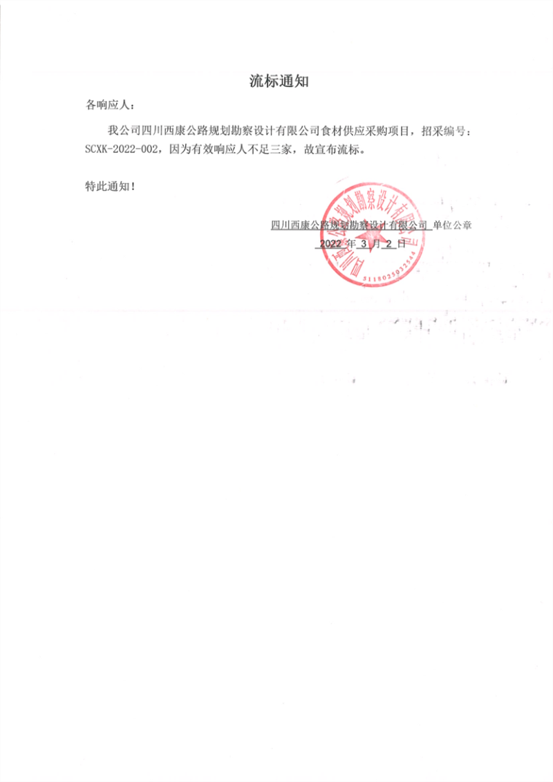 四川西康公路規(guī)劃勘察設計有限公司食材供應采購項目流標通知