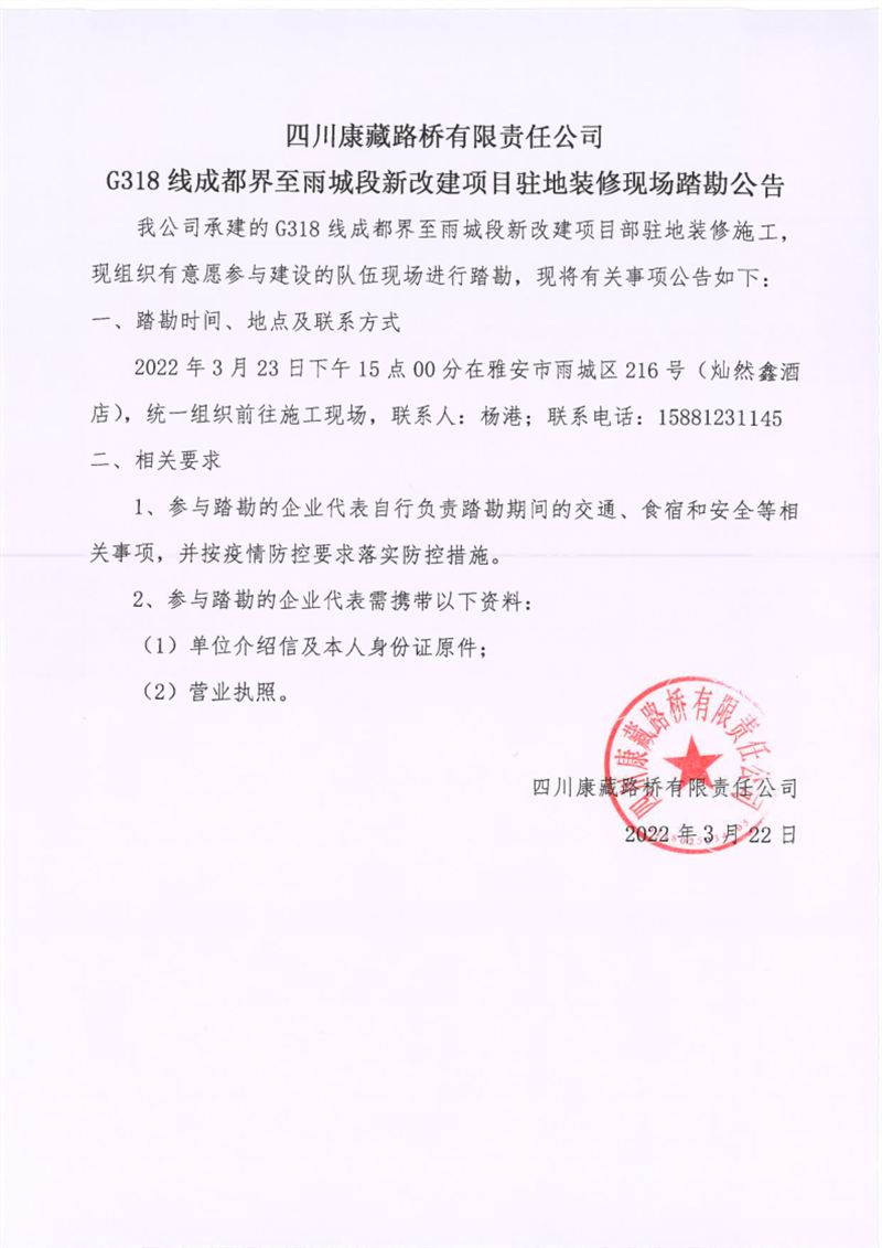 四川康藏路橋有限責(zé)任公司G318線成都界至雨城段新改建項目駐地裝修現(xiàn)場踏勘公告