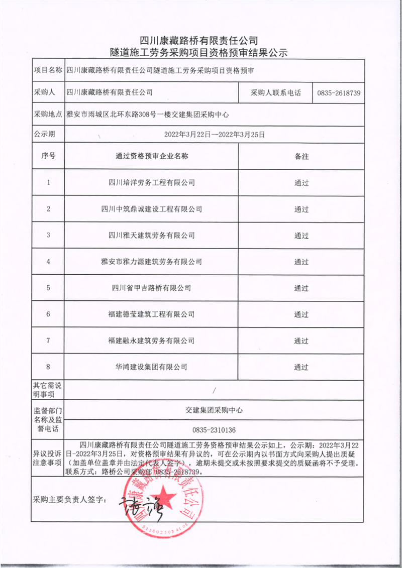 四川康藏路橋有限責任公司隧道施工勞務采購項目資格預審結(jié)果公示