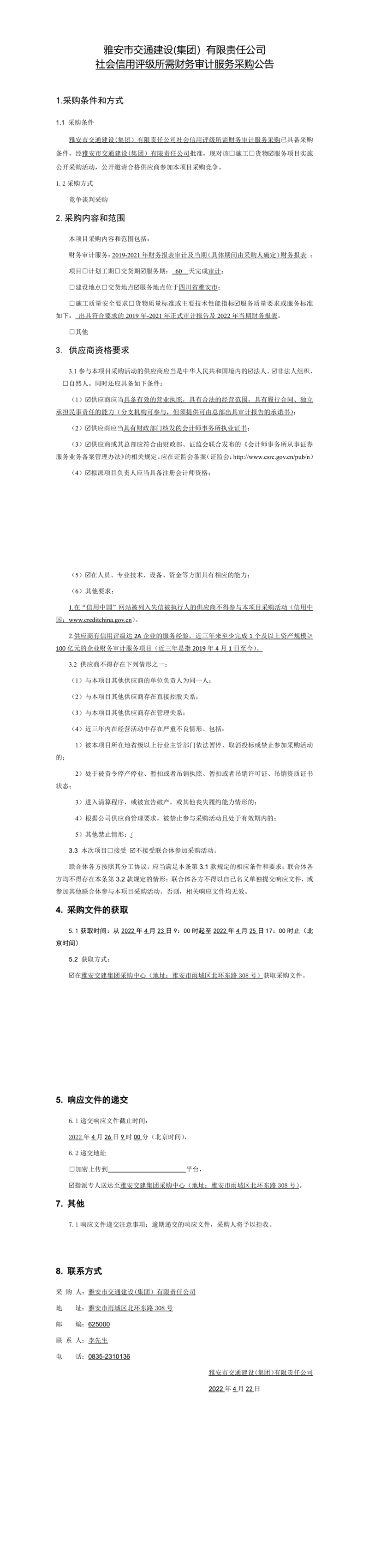 雅安市交通建設(shè)(集團(tuán))有限責(zé)任公司社會(huì)信用評(píng)級(jí)所需財(cái)務(wù)審計(jì)服務(wù)采購(gòu)公告
