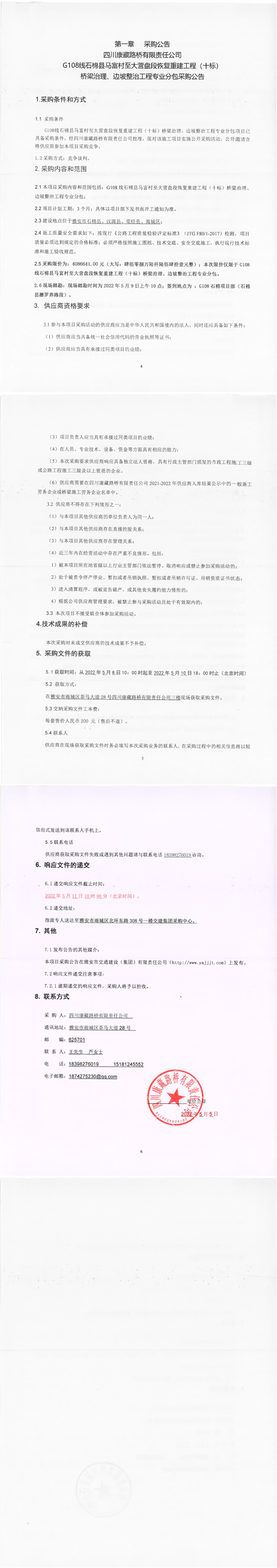 四川康藏路橋有限責(zé)任公司G108線石棉縣馬富村至大營(yíng)盤(pán)段恢復(fù)重建工程(十標(biāo))橋梁治理、邊坡整治工程專(zhuān)業(yè)分包采購(gòu)公告