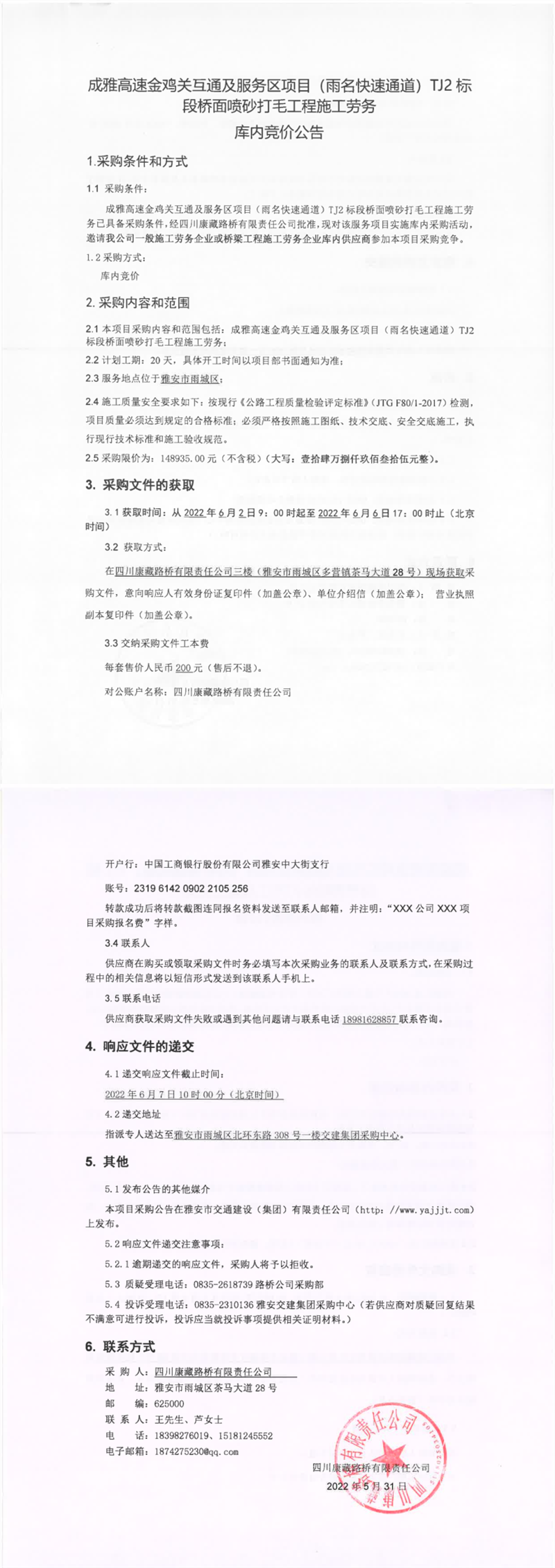 四川康藏路橋有限責任公司成雅高速金雞關(guān)互通及服務(wù)區(qū)項目(雨名快速通道)TJ2標段橋面噴砂打毛工程施工勞務(wù)庫內(nèi)競價公告