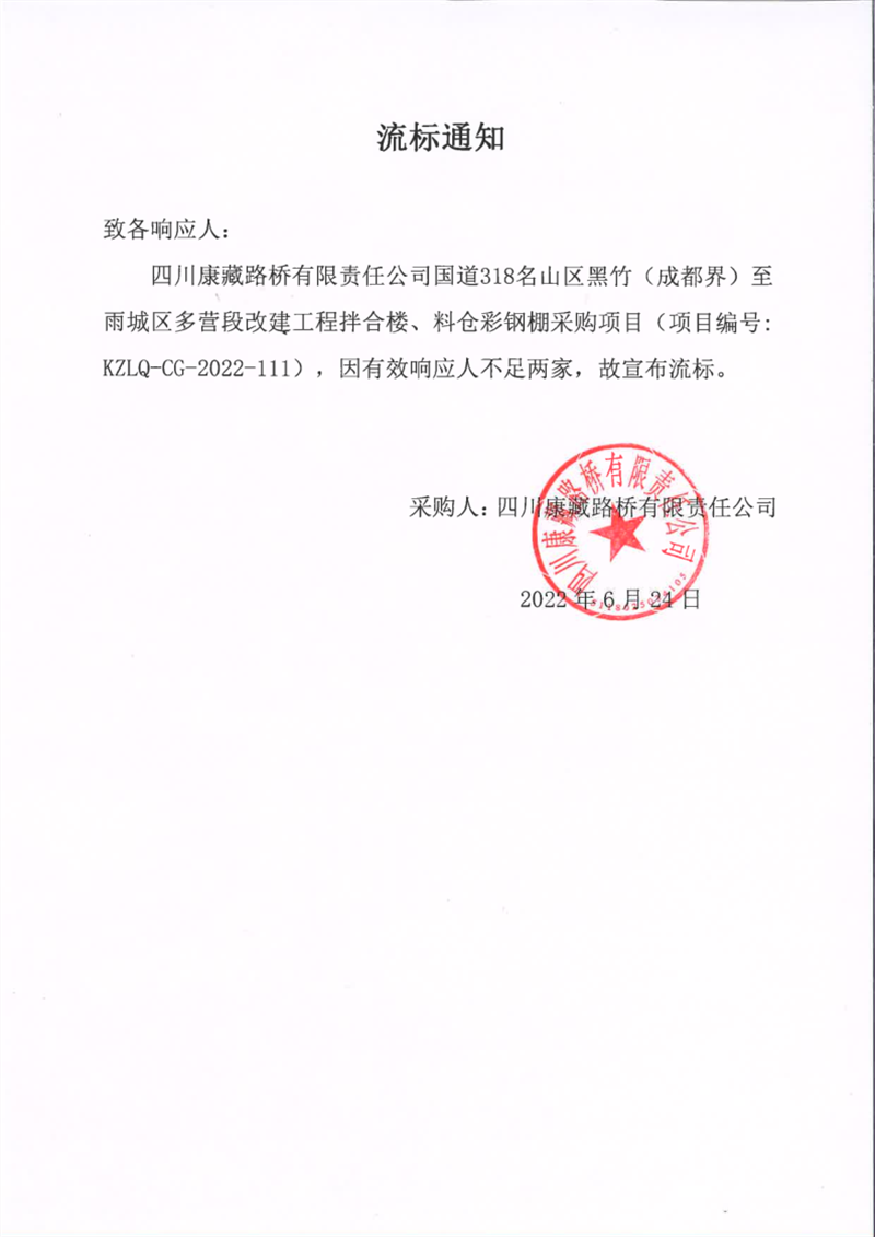 四川康藏路橋有限責(zé)任公司國道318名山區(qū)黑竹(成都界)至雨城區(qū)多營段改建工程拌合樓、料倉彩鋼棚采購項目流標(biāo)通知