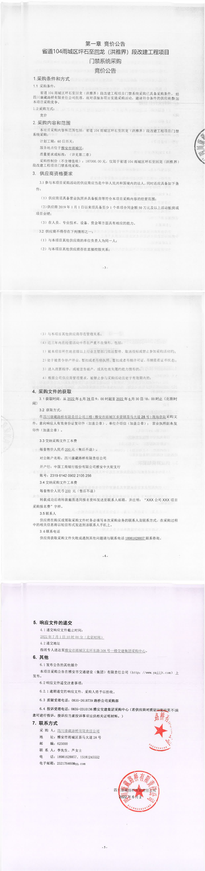 四川康藏路橋有限責(zé)任公司省道104雨城區(qū)坪石至回龍(洪雅界)段改建工程項(xiàng)目門禁系統(tǒng)采購