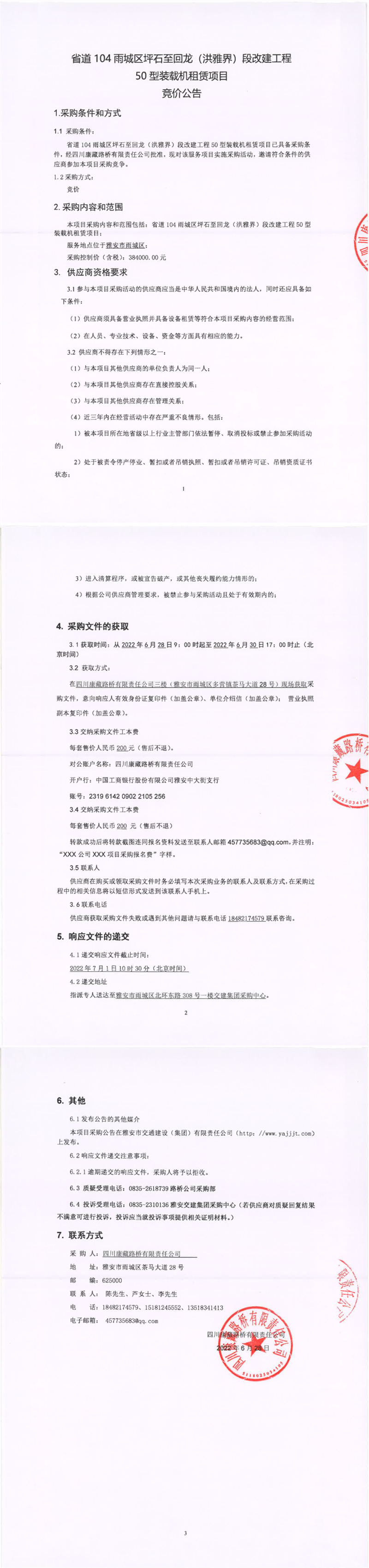 四川康藏路橋有限責任公司省道104雨城區(qū)坪石至回龍(洪雅界)段改建工程50型裝載機租賃項目競價公告
