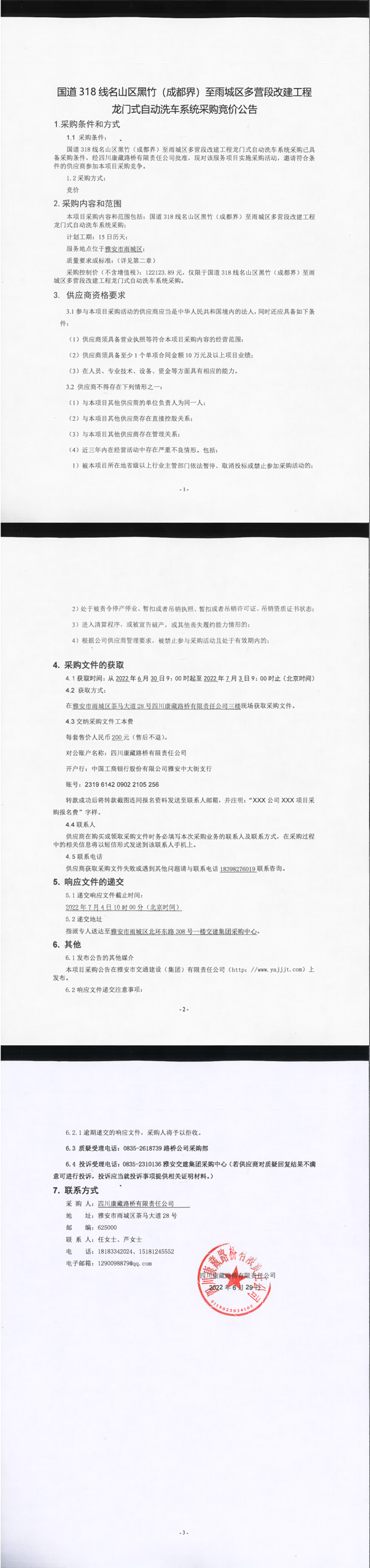 四川康藏路橋有限責任公司國道318線名山區(qū)黑竹(成都界)至雨城區(qū)多營段改建工程龍門式自動洗車系統(tǒng)采購競價公告