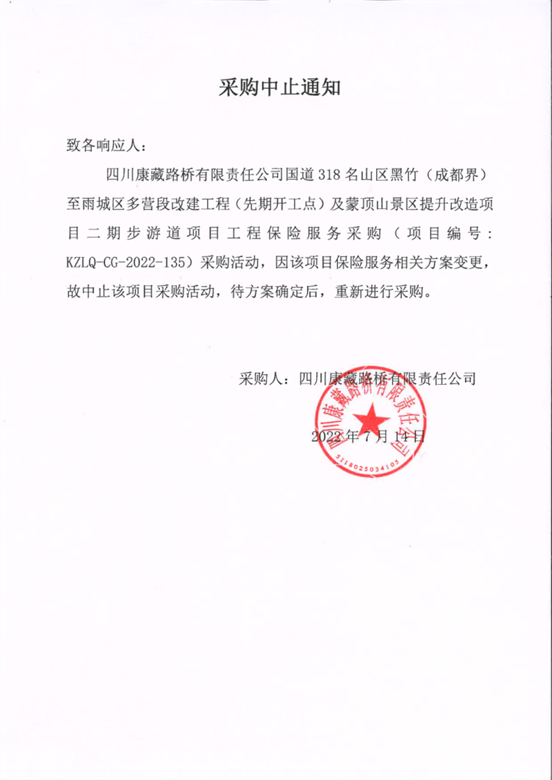 四川康藏路橋有限責(zé)任公司國道318名山區(qū)黑竹(成都界)至雨城區(qū)多營(yíng)段改建工程(先期開工點(diǎn))及蒙頂山景區(qū)提升改造項(xiàng)目二期步游道項(xiàng)目工程保險(xiǎn)服務(wù)采購中止通知