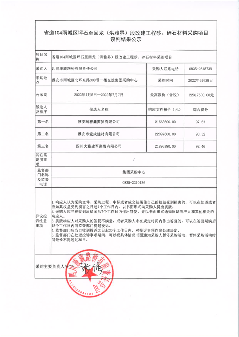 四川康藏路橋有限責(zé)任公司省道104雨城區(qū)坪石至回龍(洪雅界)段改建工程砂、碎石材料采購項目談判結(jié)果公示
