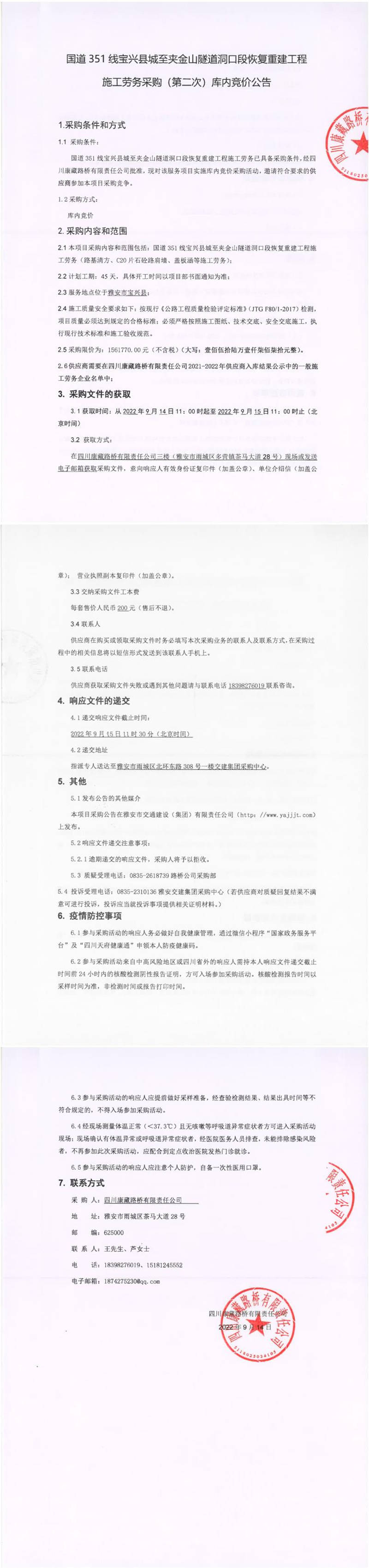 四川康藏路橋有限責(zé)任公司國道351線寶興縣城至夾金山隧道洞口段恢復(fù)重建工程施工勞務(wù)采購(第二次)庫內(nèi)競價公告