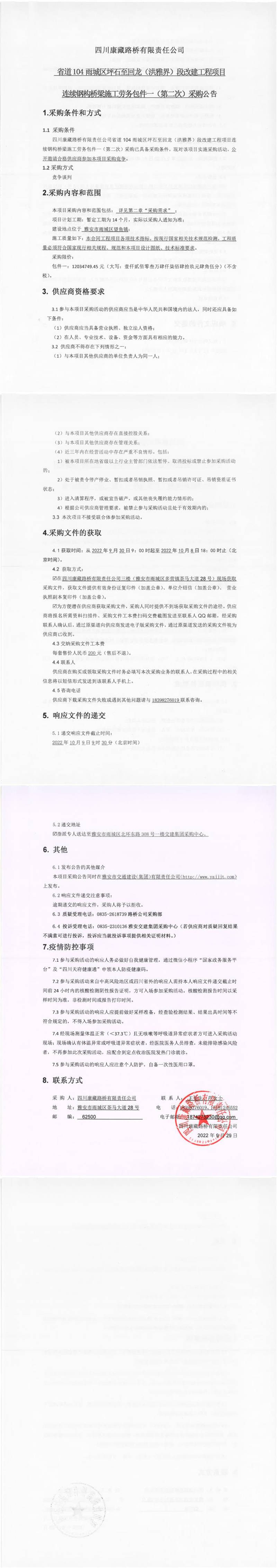 四川康藏路橋有限責任公司省道104雨城區(qū)坪石至回龍(洪雅界)段改建工程項目連續(xù)鋼構橋梁施工勞務包件一(第二次)采購公告