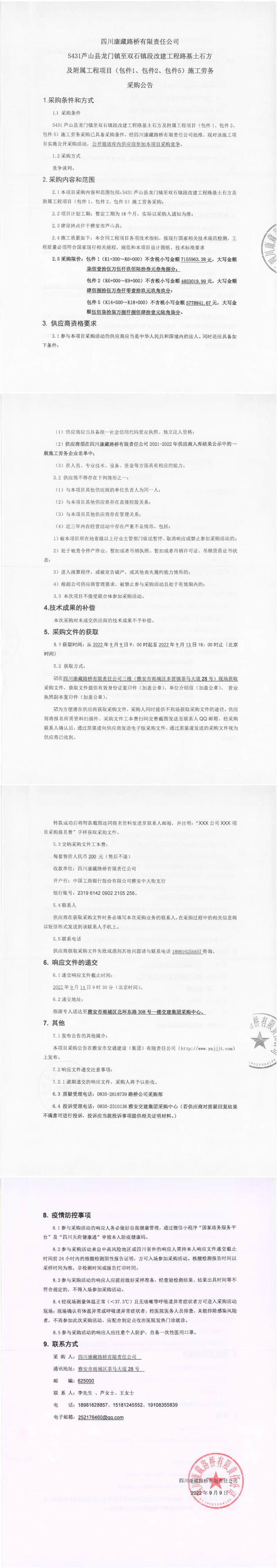 四川康藏路橋有限責(zé)任公司S431蘆山縣龍門鎮(zhèn)至雙石段改建工程路基土石方及附屬工程項(xiàng)目(包件1、包件2、包件5)施工勞務(wù)采購公告