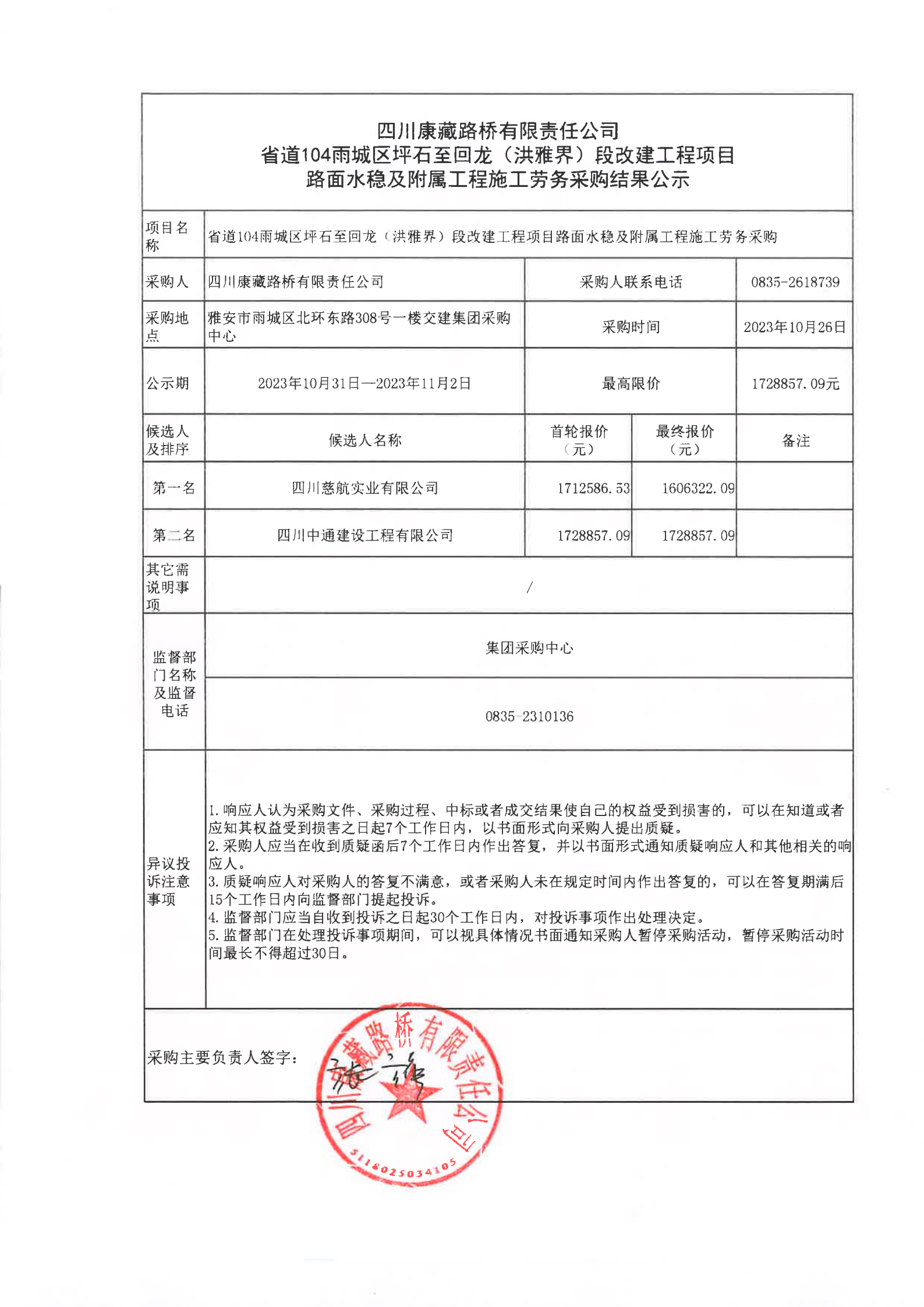 四川康藏路橋有限責任公司省道104雨城區(qū)坪石至回龍(洪雅界)段改建工程項目路面水穩(wěn)及附屬工程施工勞務采購結果公示
