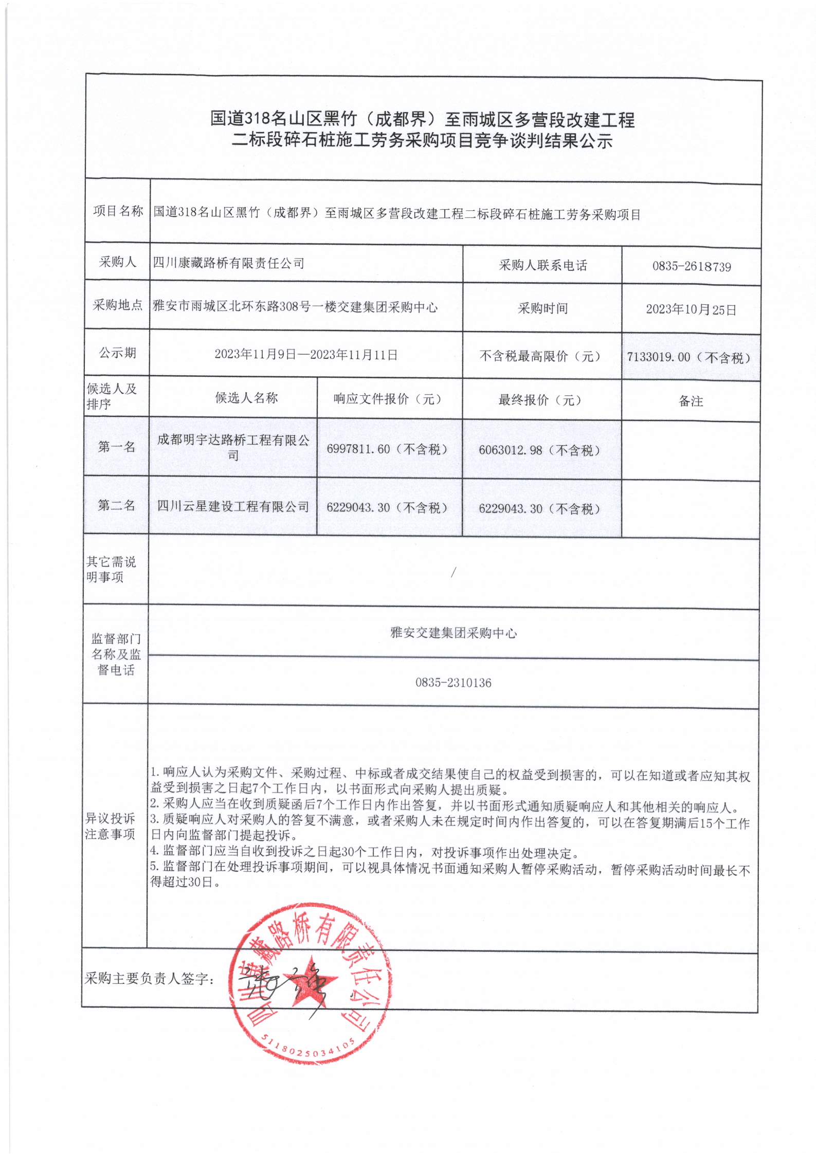 四川康藏路橋有限責(zé)任公司國道318名山區(qū)黑竹(成都界)至雨城區(qū)多營段改建工程二標(biāo)段碎石樁施工勞務(wù)采購項(xiàng)目競爭談判結(jié)果公示