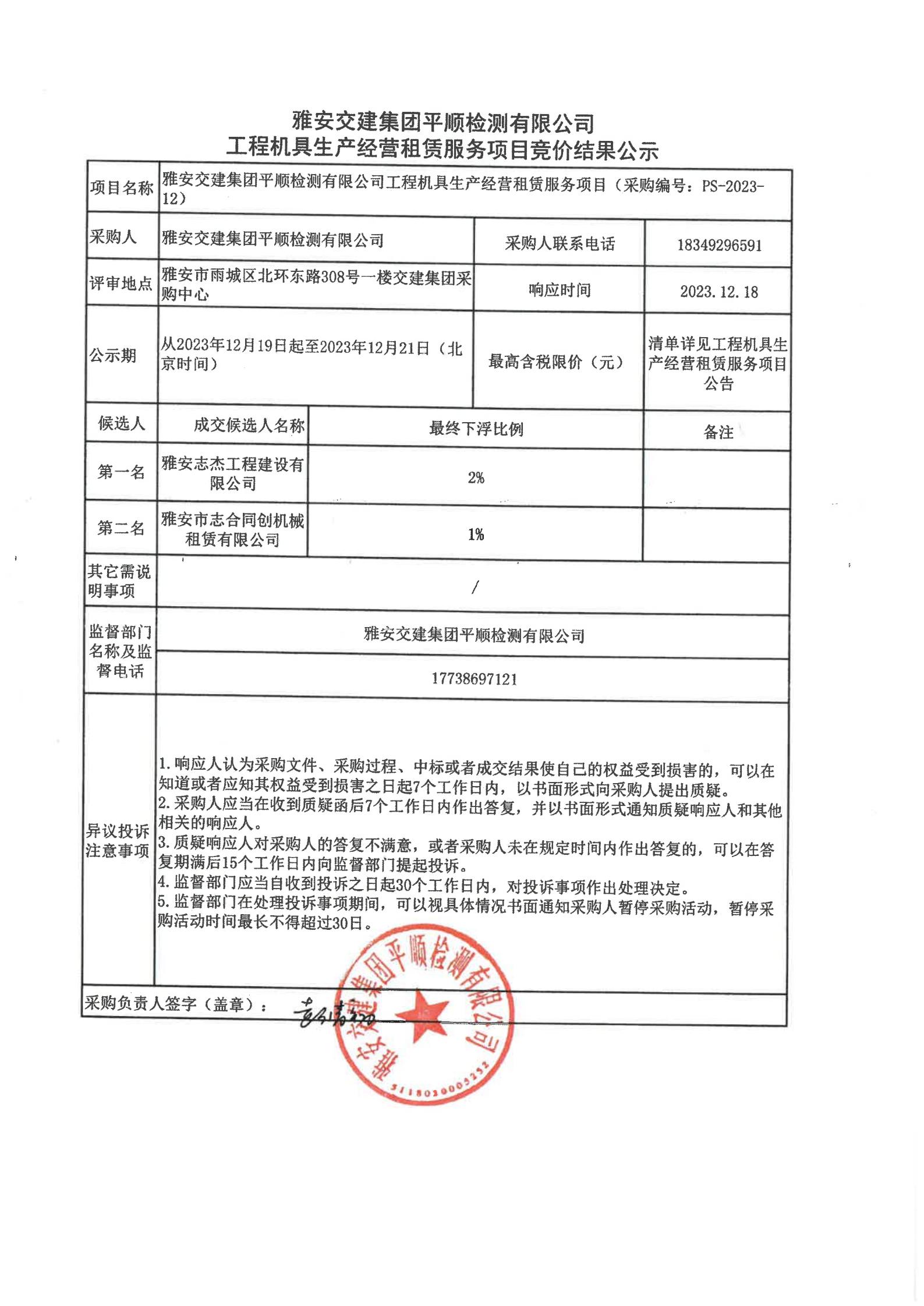 雅安交建集團平順檢測有限公司工程機具生產(chǎn)經(jīng)營租賃服務項目競價結果公示