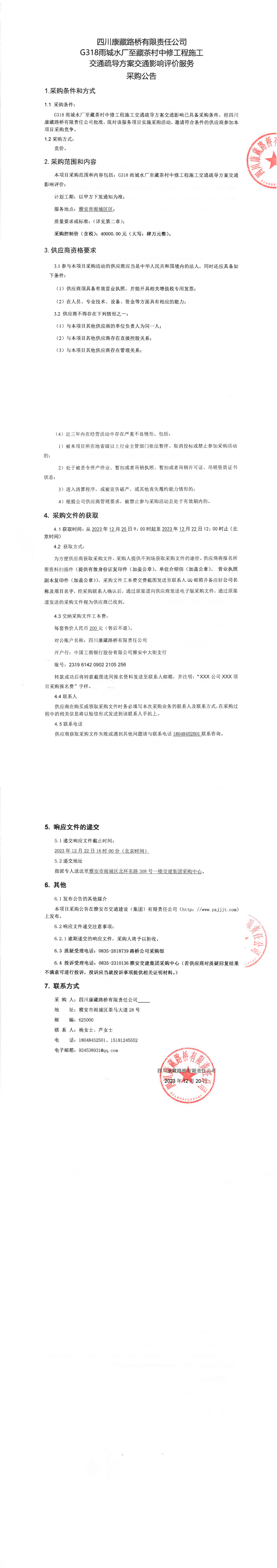 四川康藏路橋有限責任公司G318雨城水廠至藏茶村中修工程施工交通疏導方案交通影響評價服務采購公告