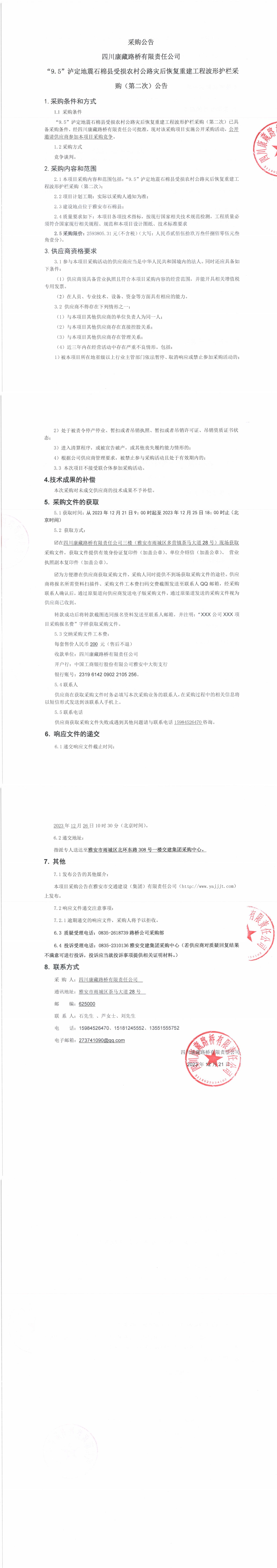 四川康藏路橋有限責(zé)任公司“9.5”瀘定地震石棉縣受損農(nóng)村公路災(zāi)后恢復(fù)重建工程波形護(hù)欄采購(gòu)(第二次)公告