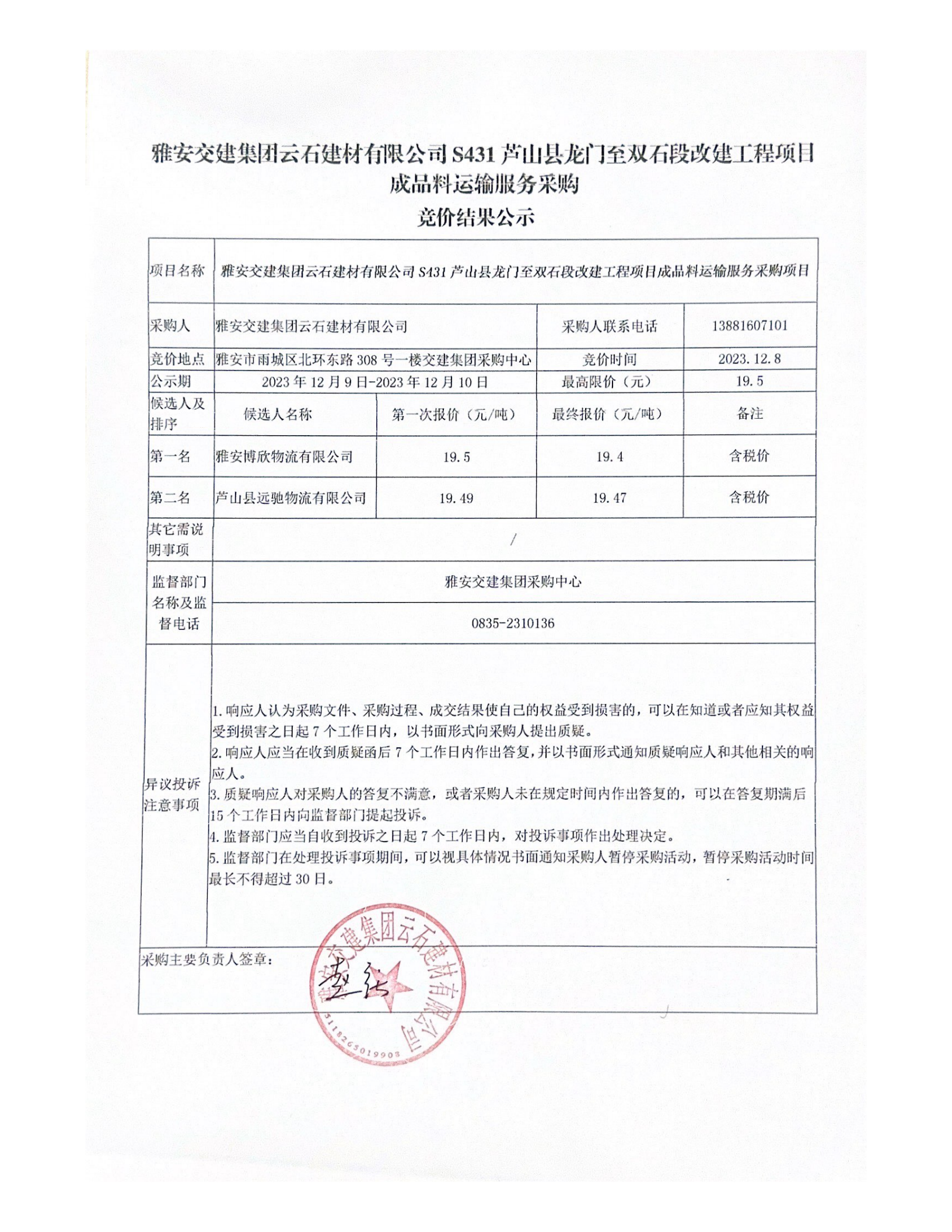 雅安交建集團(tuán)云石建材有限公司S431蘆山縣龍門(mén)至雙石段改建工程項(xiàng)目成品料運(yùn)輸服務(wù)采購(gòu)競(jìng)價(jià)結(jié)果公示