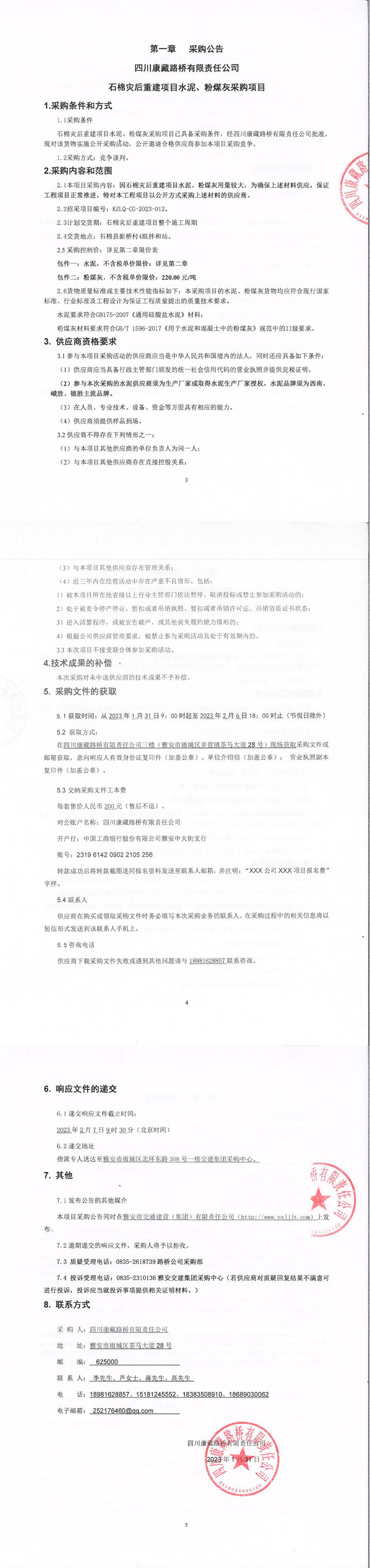 四川康藏路橋有限責(zé)任公司石棉災(zāi)后重建項(xiàng)目水泥、粉煤灰采購項(xiàng)目采購公告