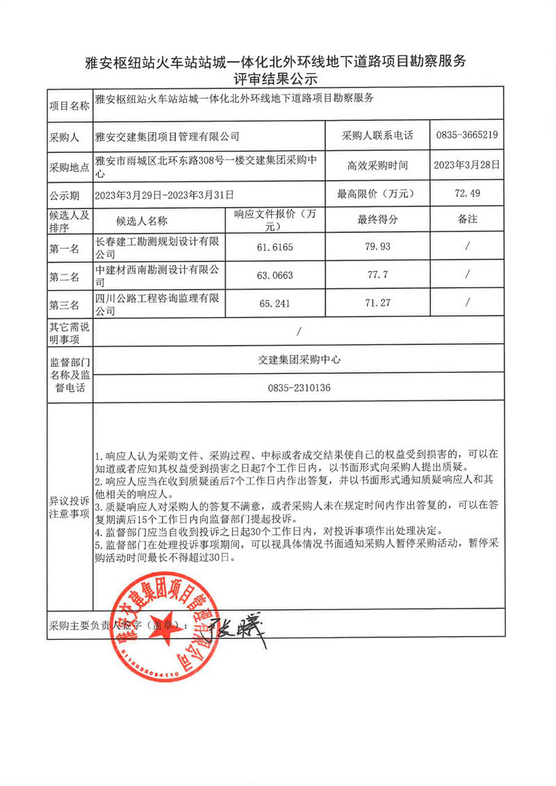 雅安交建集團(tuán)項(xiàng)目管理有限公司雅安樞紐站火車(chē)站站城一體化北外環(huán)線地下道路項(xiàng)目勘察服務(wù)評(píng)審結(jié)果公示
