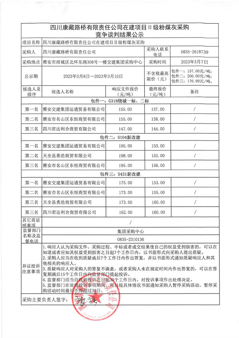 四川康藏路橋有限責(zé)任公司在建項(xiàng)目II級粉煤灰采購競爭談判結(jié)果公示