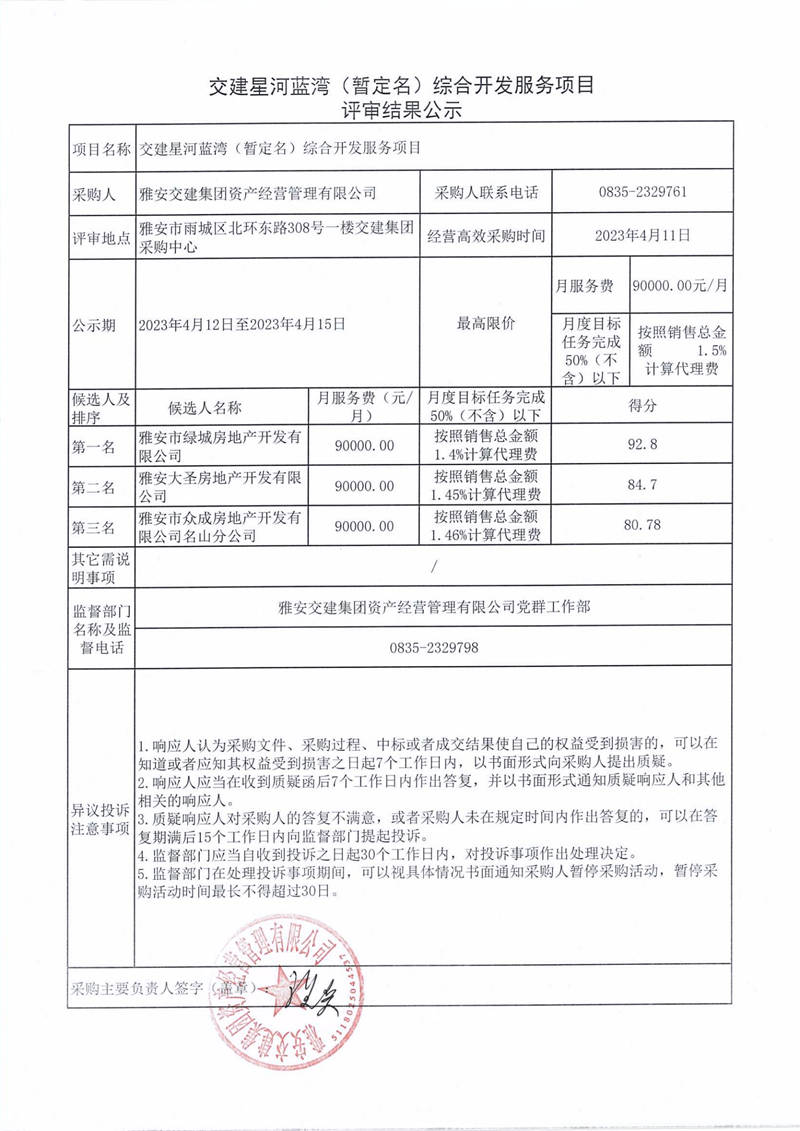 雅安交建集團資產經營管理有限公司交建星河藍灣(暫定名)綜合開發(fā)服務項目評審結果公示