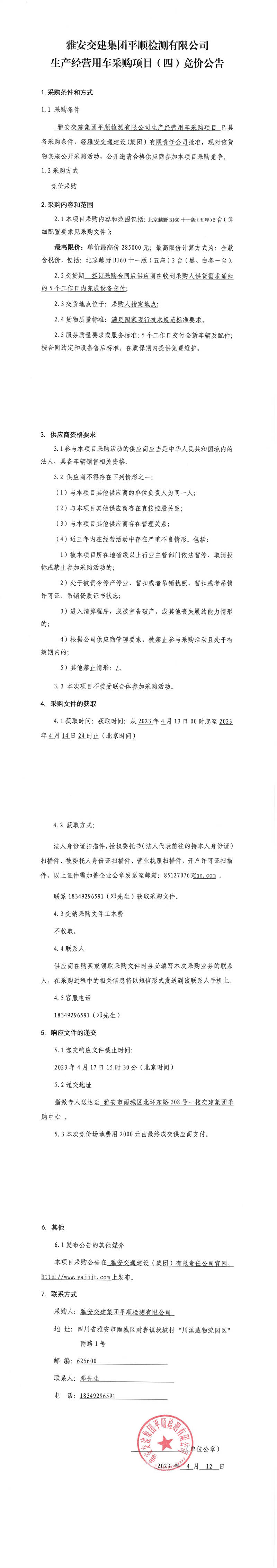 雅安交建集團(tuán)平順檢測(cè)有限公司平順公司生產(chǎn)經(jīng)營(yíng)用車采購(gòu)項(xiàng)目(四)競(jìng)價(jià)公告