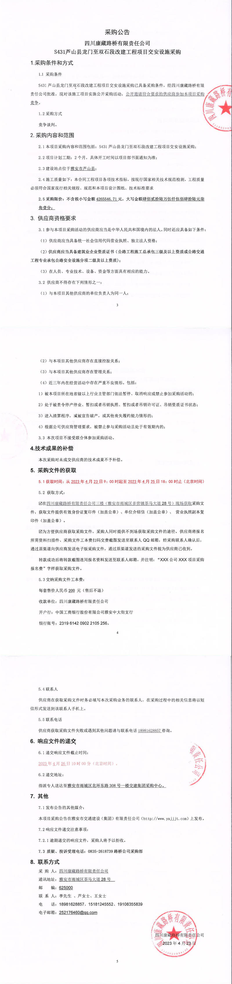 四川康藏路橋有限責(zé)任公司S431蘆山縣龍門至雙石段改建工程項(xiàng)目交安設(shè)施采購