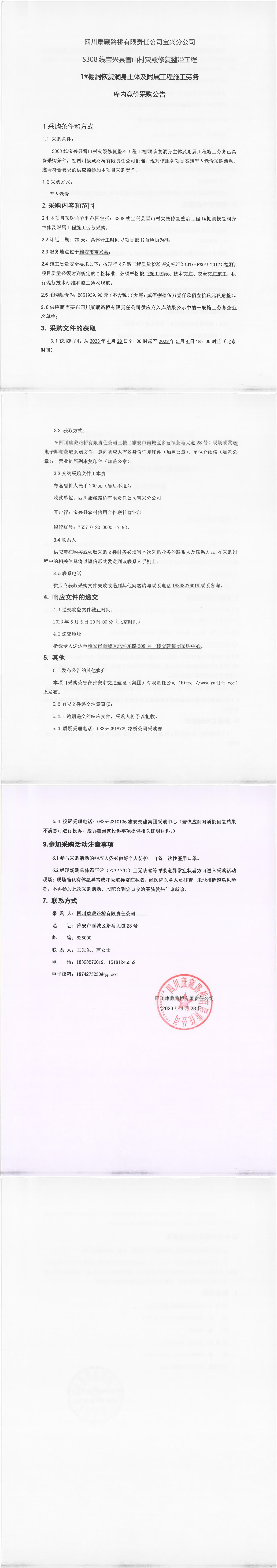 四川康藏路橋有限責(zé)任公司寶興分公司S308線(xiàn)寶興縣雪山村段災(zāi)毀修復(fù)整治工程1#棚洞恢復(fù)洞身主體及附屬工程施工勞務(wù)庫(kù)內(nèi)競(jìng)價(jià)采購(gòu)公告