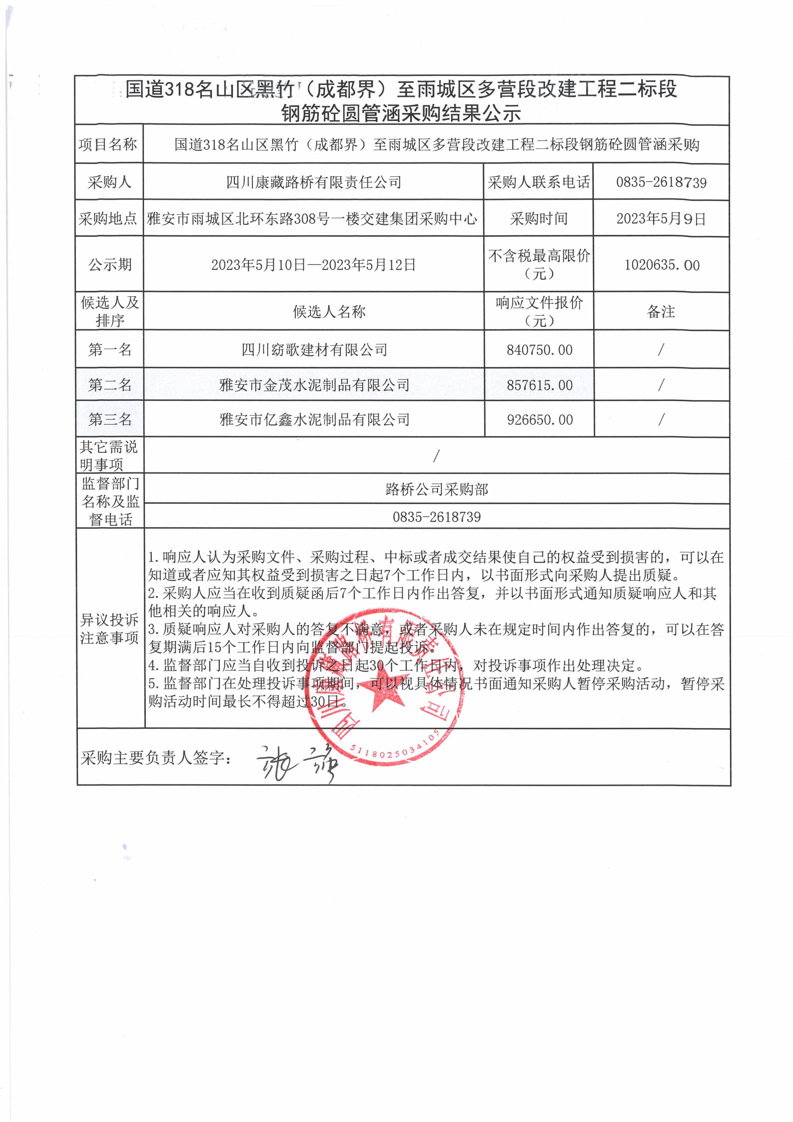 四川康藏路橋有限責(zé)任公司國道318名山區(qū)黑竹(成都界)至雨城區(qū)多營段改建工程二標(biāo)段鋼筋砼圓管涵采購結(jié)果公示