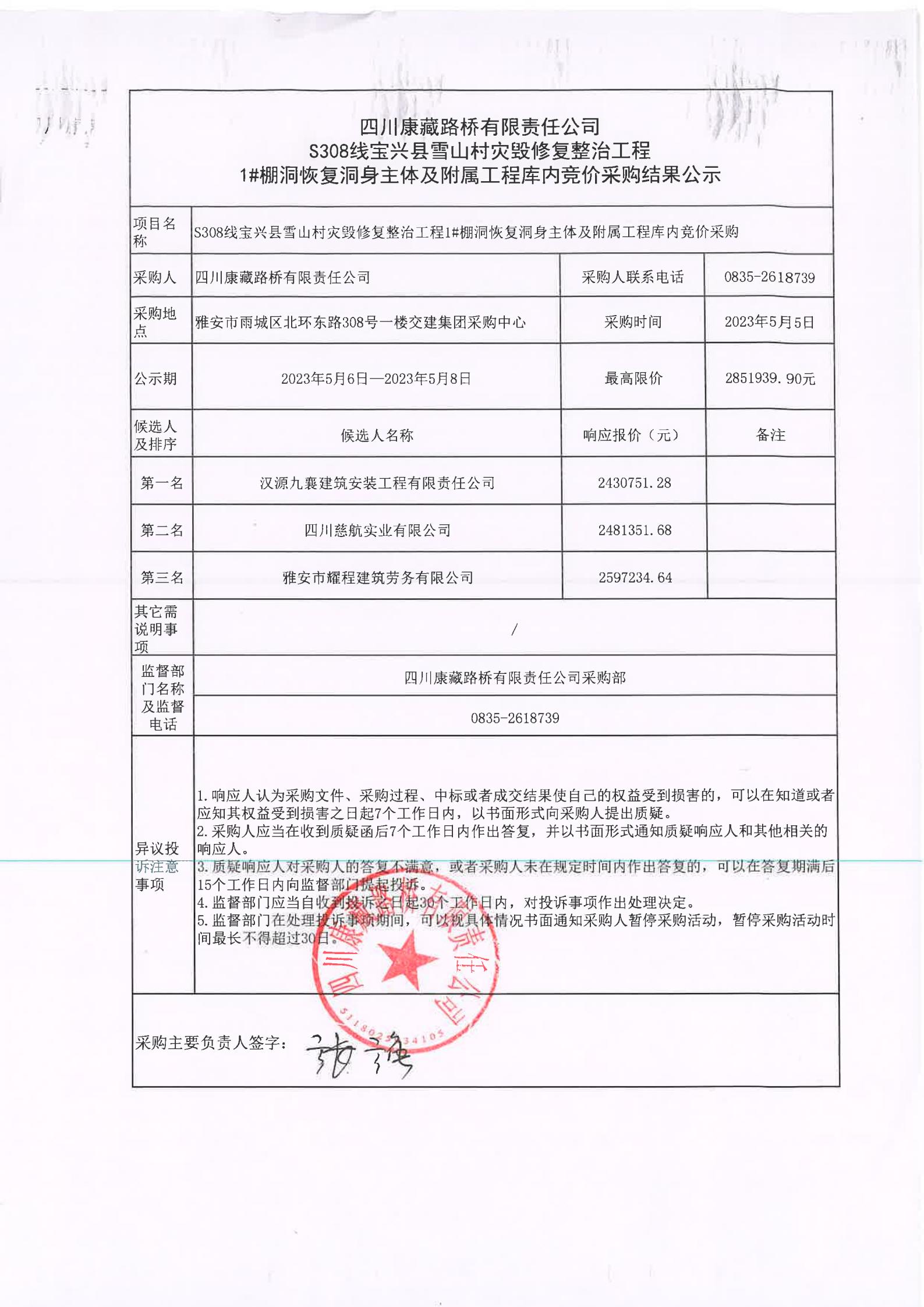 四川康藏路橋有限責(zé)任公司S308線寶興縣雪山村災(zāi)毀修復(fù)整治工程1#棚洞恢復(fù)洞身主體及附屬工程庫內(nèi)競(jìng)價(jià)采購結(jié)果公示