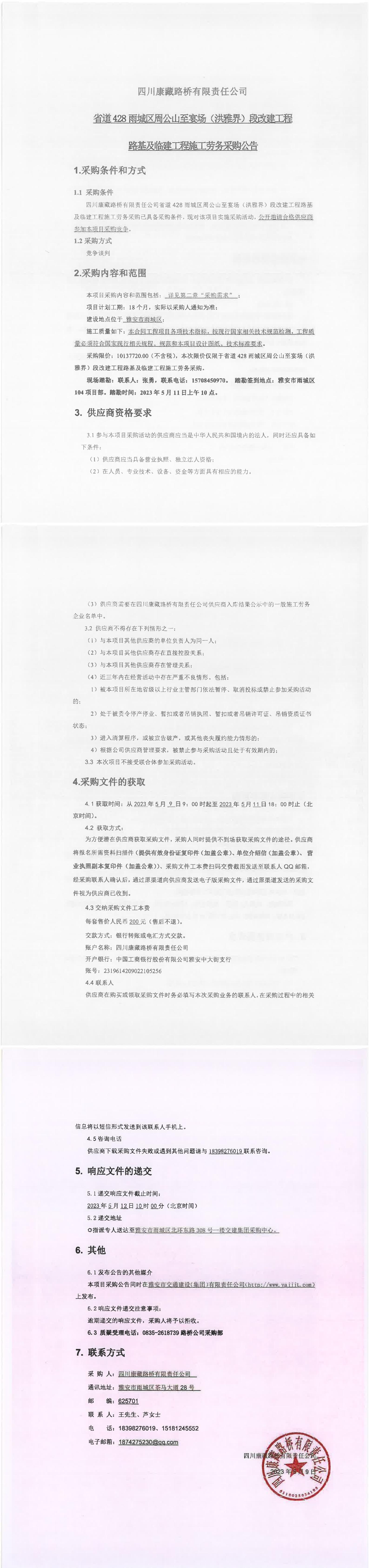 四川康藏路橋有限責(zé)任公司省道428雨城區(qū)周公山至宴場(chǎng)(洪雅界)段改建工程路基及臨建工程施工勞務(wù)采購公告