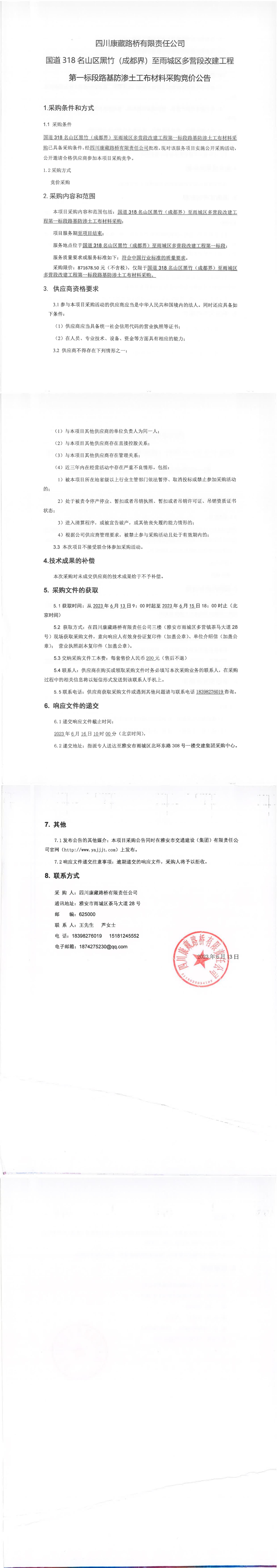 四川康藏路橋有限責(zé)任公司國(guó)道318名山區(qū)黑竹(成都界)至雨城區(qū)多營(yíng)段改建工程第一標(biāo)段路基防滲土工布材料采購競(jìng)價(jià)公告