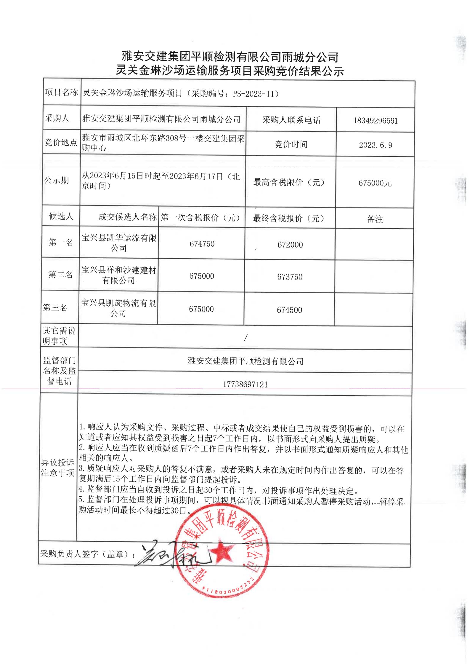 雅安交建集團平順檢測有限公司雨城分公司靈關(guān)金琳沙場運輸服務(wù)競價結(jié)果公示