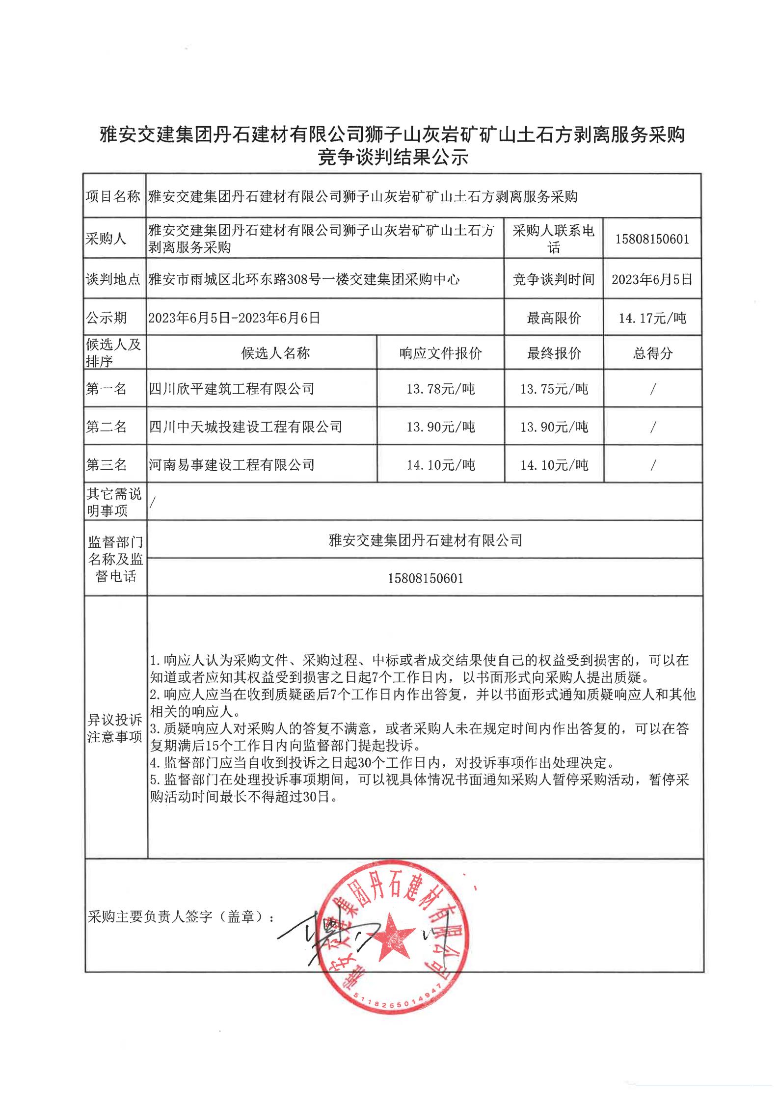 雅安交建集團丹石建材有限公司獅子山灰?guī)r礦礦山土石方剝離服務(wù)采購競爭談判結(jié)果公示